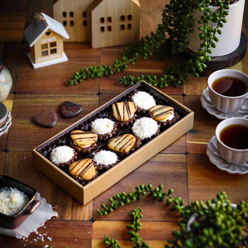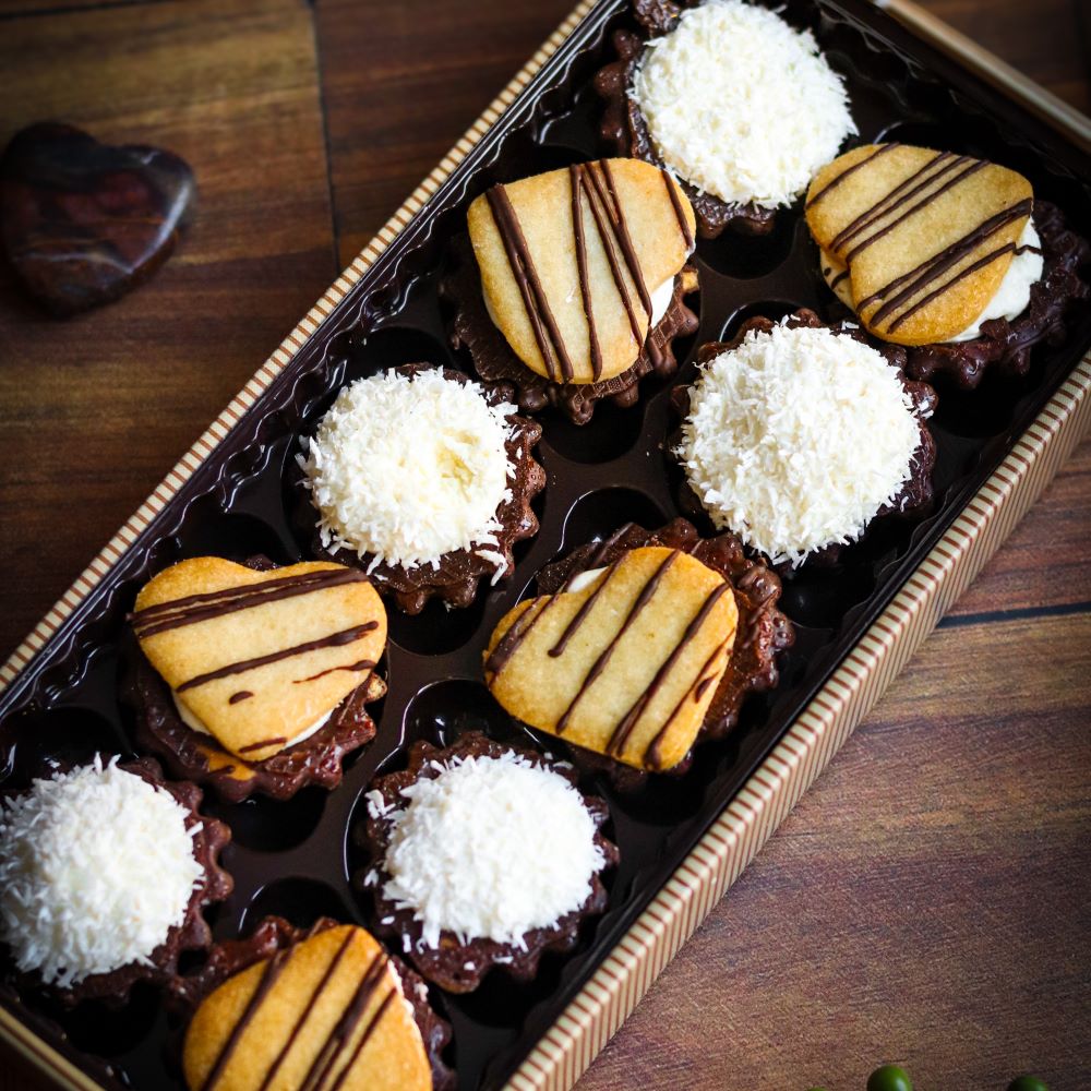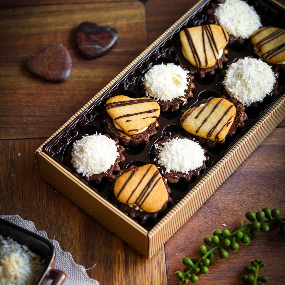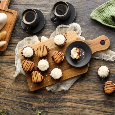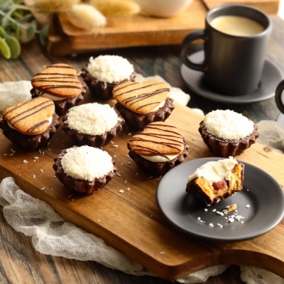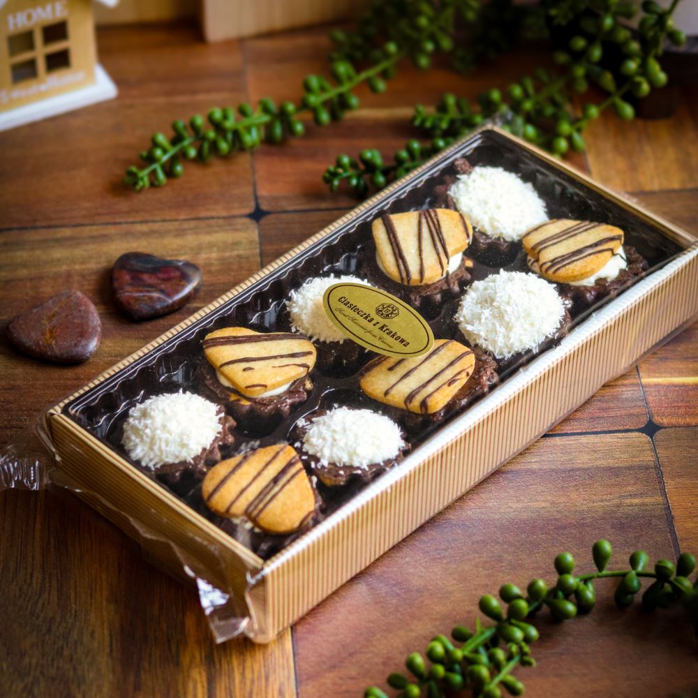 Kruche babeczki wypełnione delikatnym kremem kokosowym i marmoladą, udekorowane wiórkami kokosowymi oraz kruchym ciasteczkiem polanym polewą. Każda babeczka jest starannie przygotowana, by zachwycić smakiem i wyglądem. Idealne na elegancki dodatek do kawy, spotkania rodzinne lub jako wyjątkowy prezent. Zapakowane w eleganckie pudełko, doskonale sprawdzą się na każdą okazję.