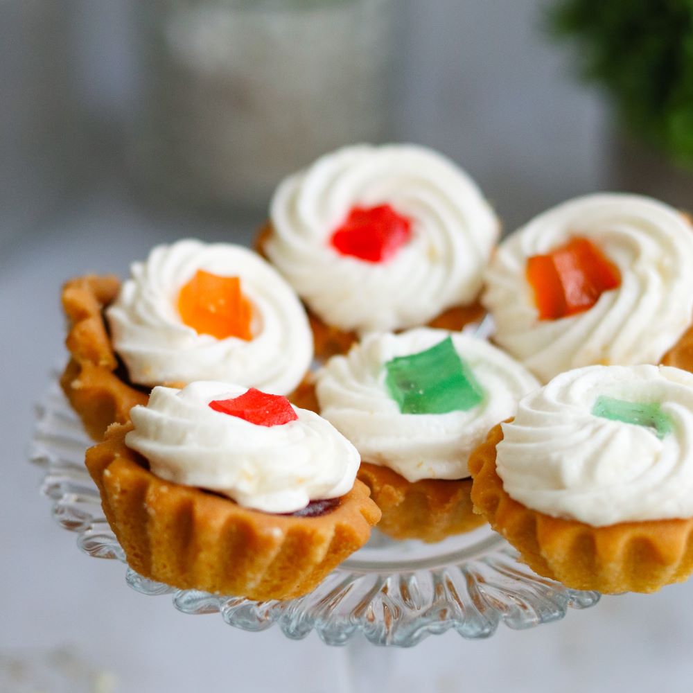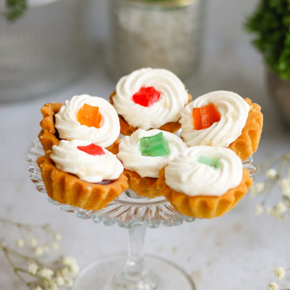 Delikatny deser na kruchym korpusie, wypełniony owocową marmoladą. Zwieńczony lekką, puszystą pianką i udekorowany kolorową galaretką, zachwyca smakiem i wyglądem. Idealny na słodkie przyjęcia, bankiety czy jako subtelna przekąska do kawy.
