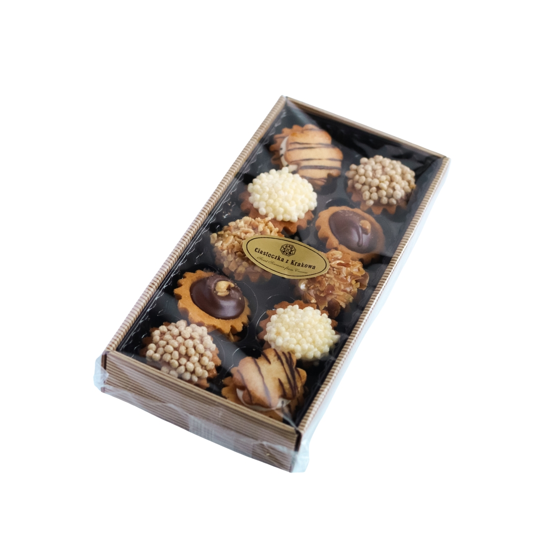 Ręcznie wykonane kruche babeczki, wypełnione kremem o smaku waniliowym lub czekoladowym oraz marmoladą wieloowocową. Udekorowane orzeszkami arachidowymi, marcepanem, chrupiącymi kulkami ryżowymi i migdałami, tworzą niepowtarzalną kompozycję smaków. Zapakowane w małe pudełko, pięknie wyeksponowane w eleganckiej wytłoczce, są idealnym wyborem na prezent lub słodką przekąskę na każdą okazję.