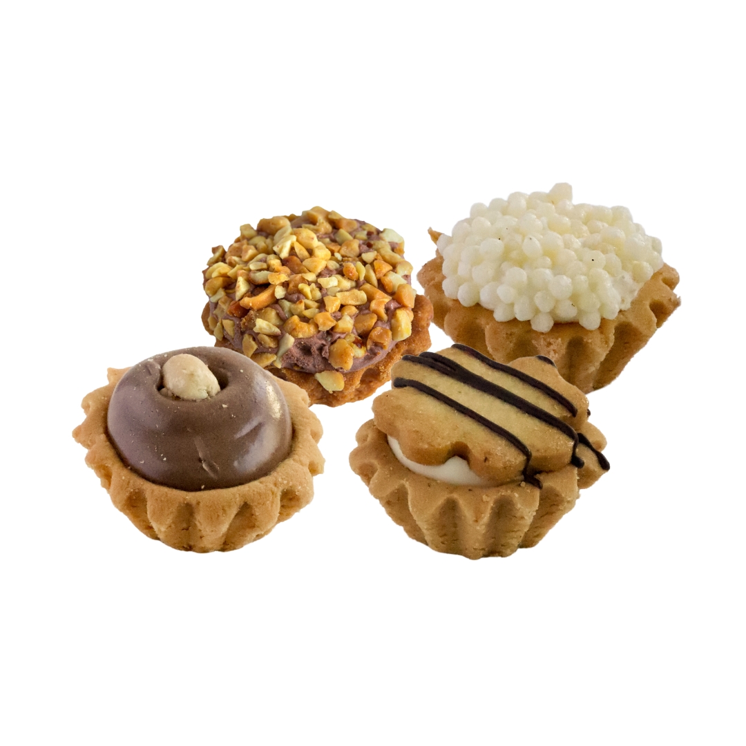 Ręcznie wykonane kruche babeczki, wypełnione kremem o smaku waniliowym lub czekoladowym oraz marmoladą wieloowocową. Udekorowane orzeszkami arachidowymi, marcepanem, chrupiącymi kulkami ryżowymi i migdałami, tworzą niepowtarzalną kompozycję smaków. Idealne na każdą okazję – do kawy, na przyjęcia lub jako wyjątkowy, słodki upominek.