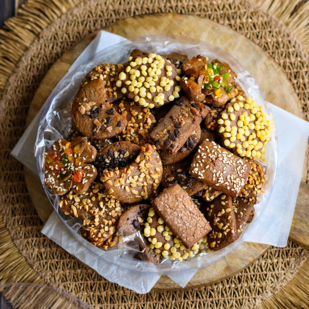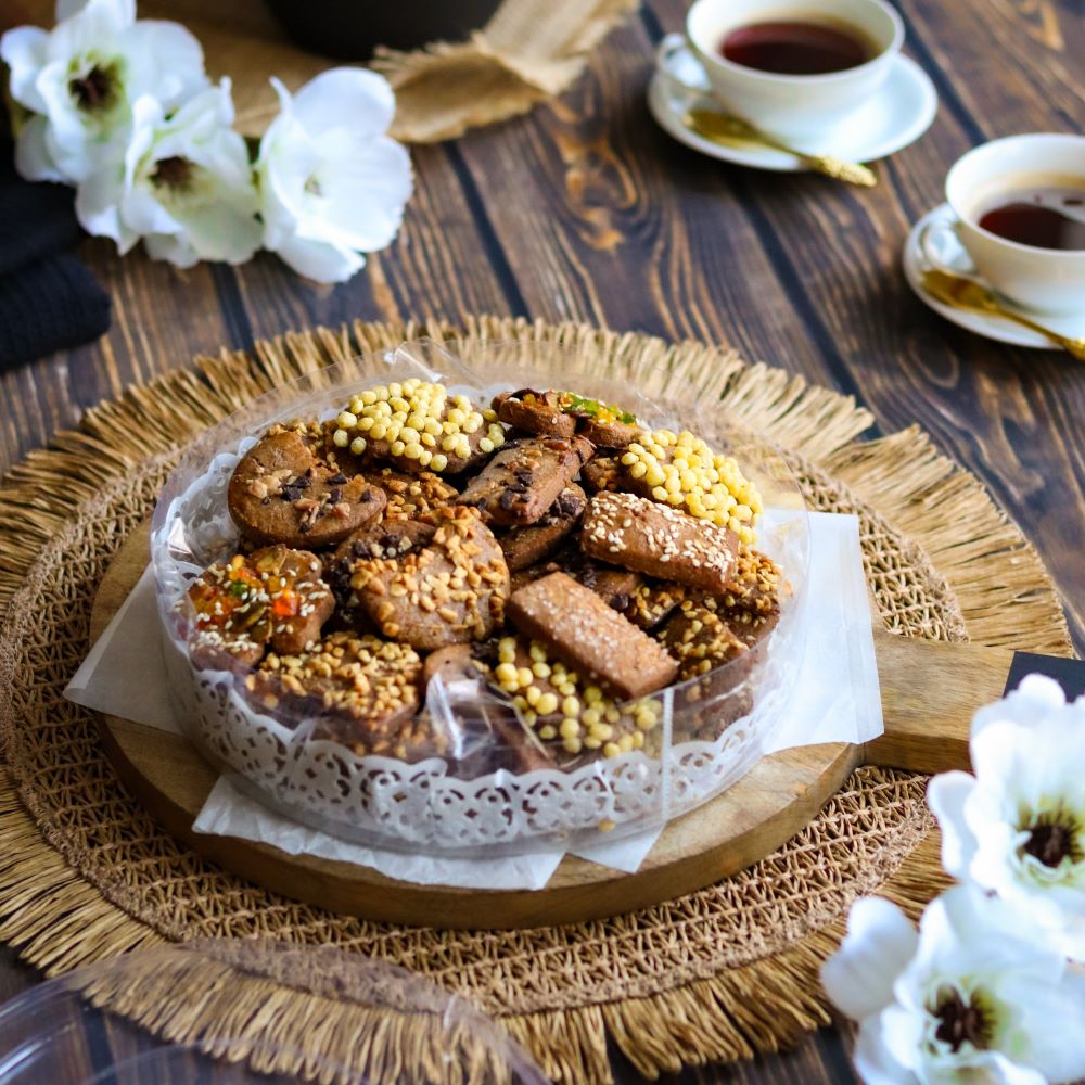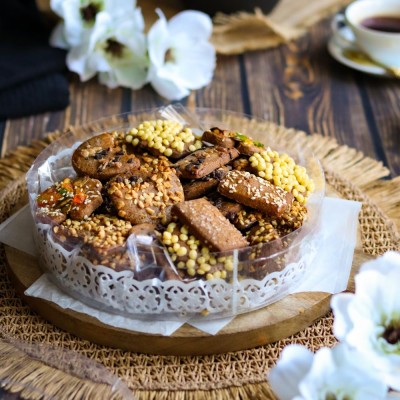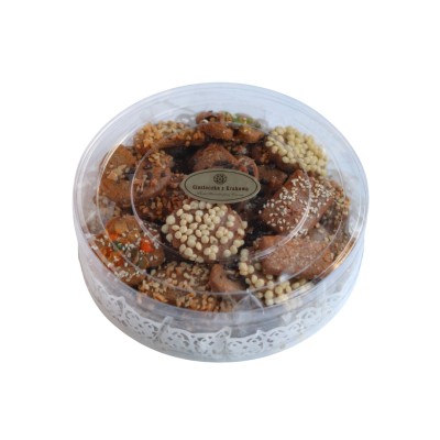 Składniki: mąka pszenna, tłuszcz roślinny (palmowy, rzepakowy), cukier, syrop cukrowy inwertowany, orzeszki arachidowe, przyprawa do piernika, masa jajowa pasteryzowana, sezam, posypka deserowa (cukier, tłuszcz roślinny nieutwardzony, odtłuszczone kakao w proszku (16%), emulgator: lecytyny (z soi), środek powlekający, syrop glukozowy, aromaty), kulka ryżowa ze słodem (mąka ryżowa, mąka kukurydziana, mąka pszenna, cukier, ekstrakt słodowy), ziarno dyni, cukinia kandyzowana, substancja spulchniająca: soda oczyszczona, sól. Może zawierać inne orzechy oraz mleko.