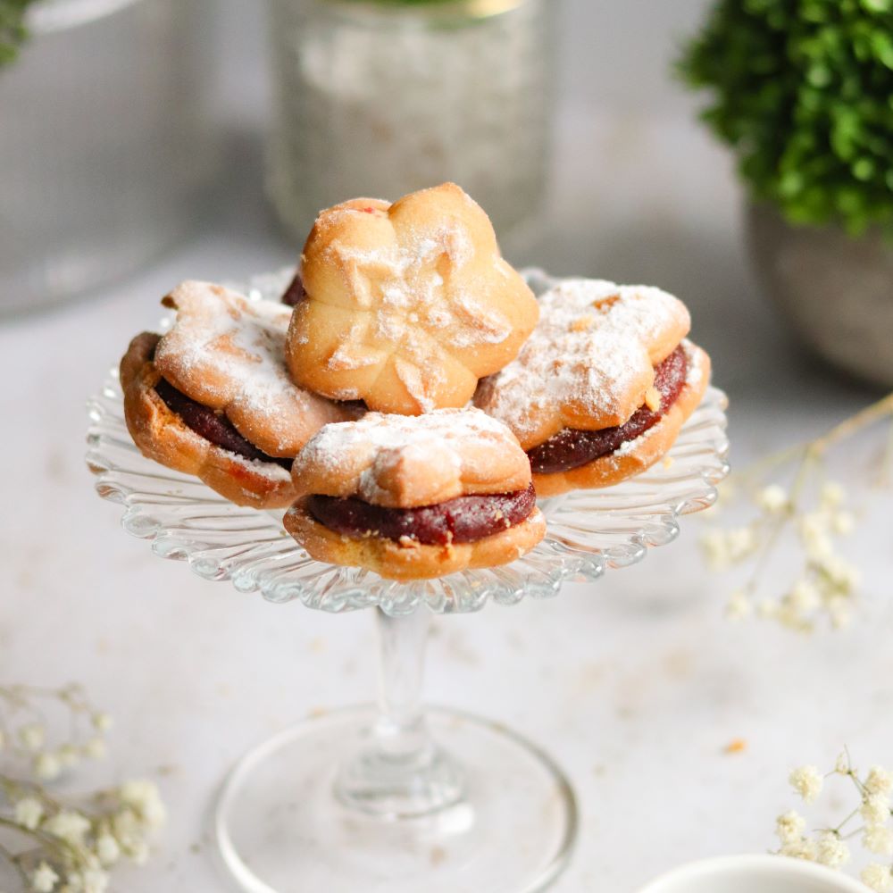 Delikatne i rozpływające się w ustach ciasteczka połączone warstwą jagodowej marmolady tworzą duet pełen owocowego aromatu. Ich lekka struktura i subtelna słodycz doskonale komponują się z pudrowym wykończeniem, które dodaje im uroku i klasycznego charakteru. Idealne do filiżanki herbaty lub jako mała, słodka przyjemność w ciągu dnia.