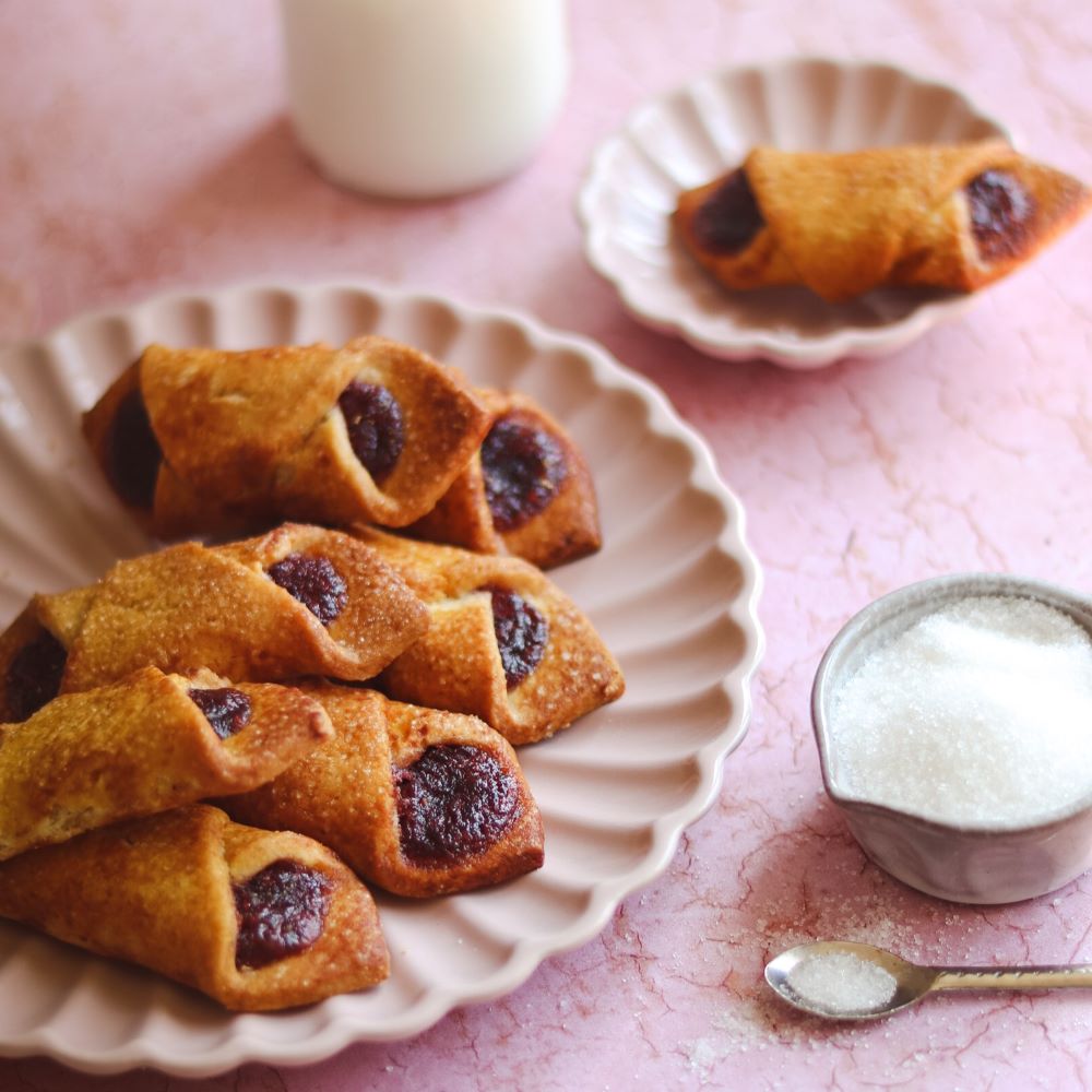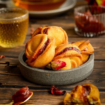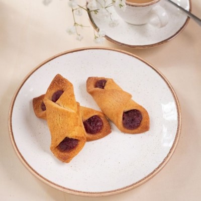 Jagodzianki to kruche ciasteczka wypełnione marmoladą o smaku jagodowym. Delikatne ciasto łączy się tu z owocową nutą nadzienia, tworząc lekką, przyjemną kompozycję smakową. Ręcznie robione, uniwersalne i łatwe do podzielenia się z innymi. Doskonale sprawdzą się jako kruche ciasteczka na prezent, słodki dodatek do kawy lub drobny upominek na każdą okazję.