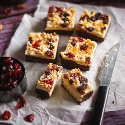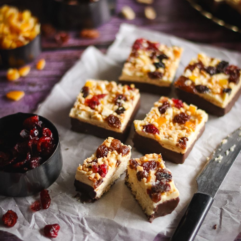 Kostka bakaliowa to wyjątkowy deser, który łączy w sobie chrupiące wafle i krem o delikatnym, śmietankowym smaku. Każda warstwa wafli przekładana jest aksamitnym kremem, a całość oblewana polewą o smaku czekoladowym, dodającą słodkiego wykończenia. Każde ciasteczko jest bogato udekorowane bakaliami: żurawiną, rodzynkami, skórką pomarańczową, płatkami kukurydzianymi i orzeszkami arachidowymi, które nadają mu wyjątkowej tekstury i bogatego smaku. To idealny wybór dla miłośników słodkości z dodatkiem owoców i orzechów, doskonały do kawy czy na specjalne okazje.