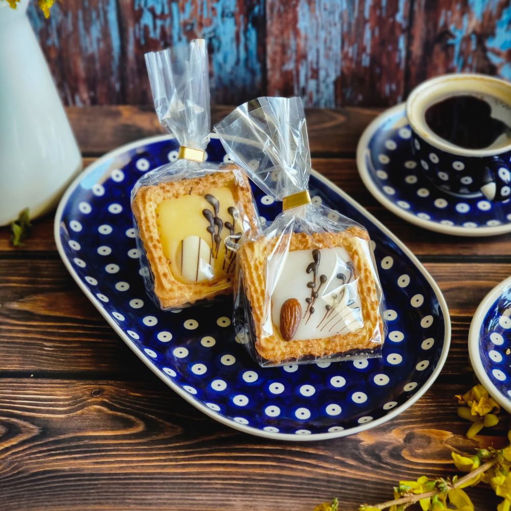 Tradycyjny Mazurek Wielkanocny w mini wersji! Kruche, maślane ciasto przełożone aromatyczną marmoladą, udekorowane marcepanem, polewą deserową i lukrem. Idealny na świąteczny stół lub jako słodki upominek.