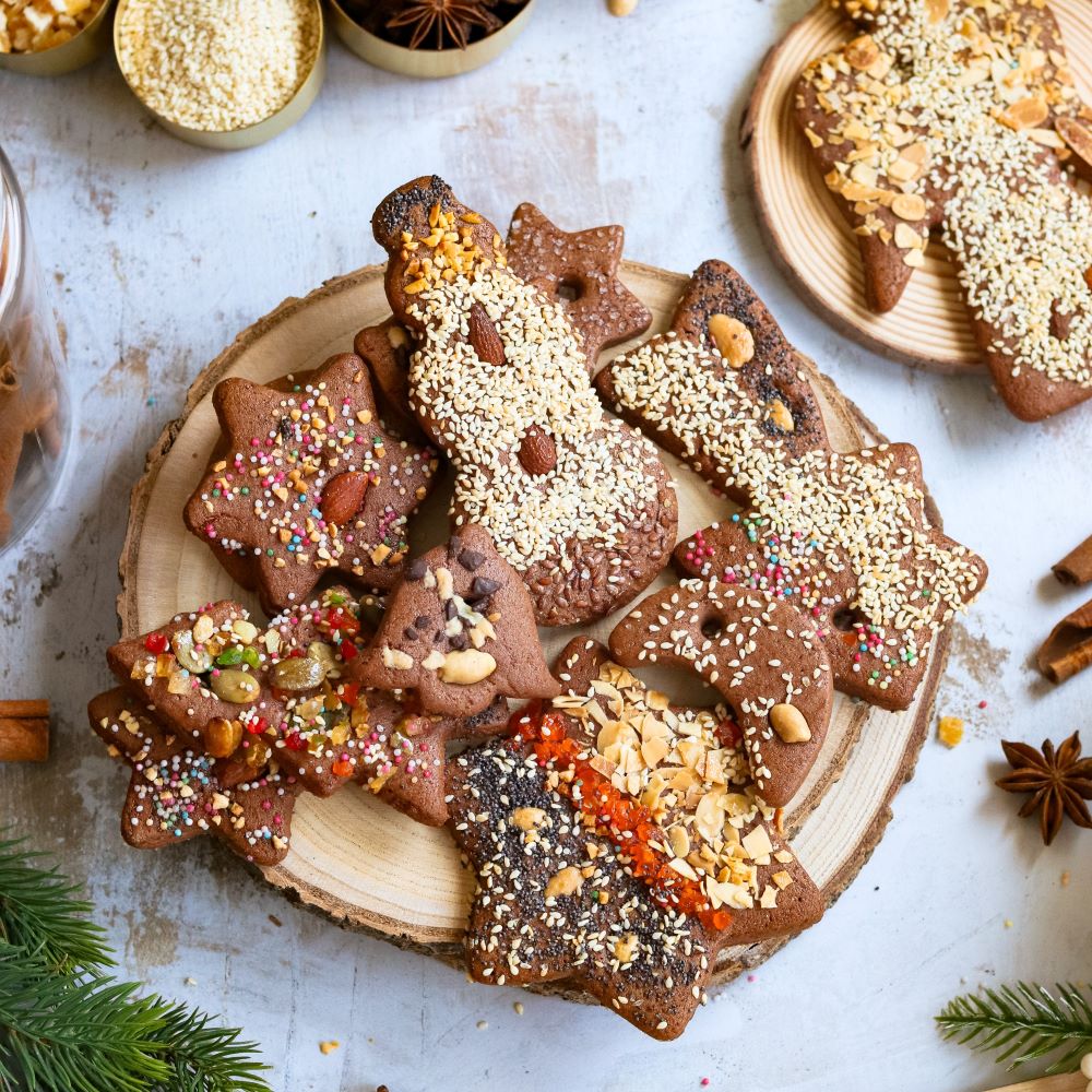 Składniki: mąka pszenna, tłuszcz roślinny (palmowy, rzepakowy), cukier, syrop cukrowy inwertowany, masa jajowa pasteryzowana, przyprawa do piernika, syrop glukozowy, sezam, migdały, kakao w proszku, orzeszki arachidowe, orzechy laskowe, mak niebieski, len niełuszczony, cukinia kandyzowana, ziarno dyni, soda oczyszczona, sól. Może zawierać inne orzechy, mleko oraz soję.