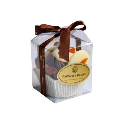 Krążki z białej i deserowej masy czekoladopodobnej, udekorowane bakaliami: żurawiną, orzeszkami arachidowymi, rodzynkami i suszonymi morelami. Zapakowane w małe, przezroczyste pudełko przewiązane wstążką, stanowią idealny wybór na prezent lub jako elegancki dodatek do kawy. Słodka kompozycja, która zachwyci smakiem i wyglądem!