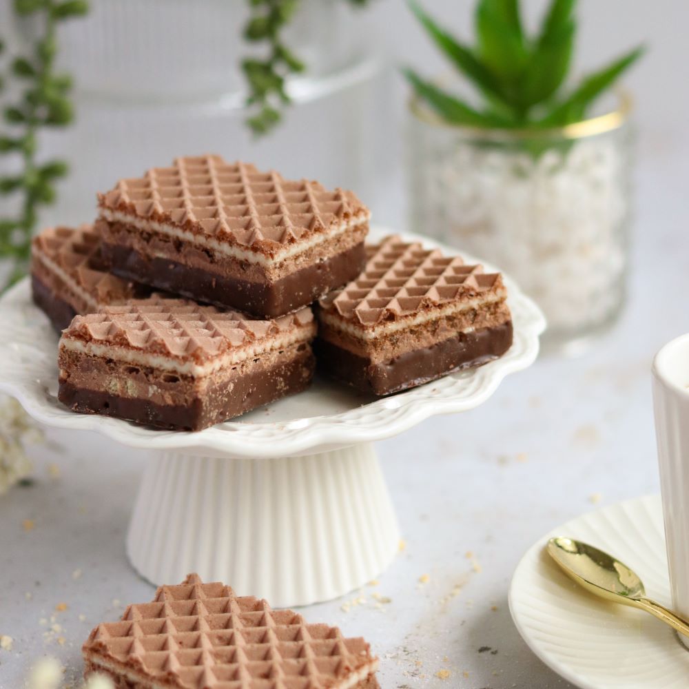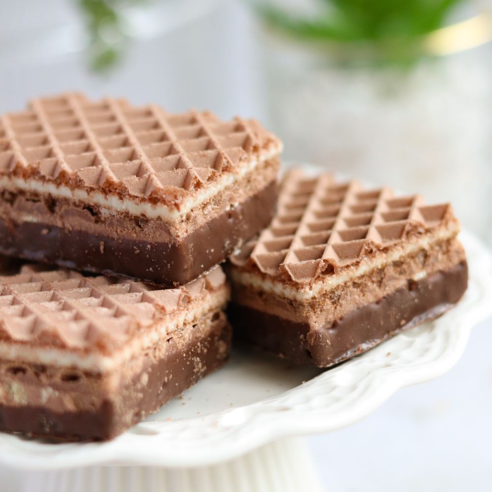 Chrupiące wafelki kakaowe przełożone kremem śmietankowym i orzechowym – z dodatkiem drobno siekanych orzeszków arachidowych. Całość delikatnie oblana polewą deserową, która podkreśla głębię smaku. Wyważone połączenie słodyczy i orzechowego aromatu, idealne dla miłośników klasycznych, ale wyrafinowanych przekąsek.