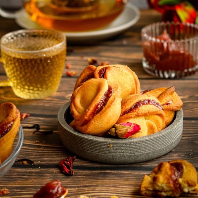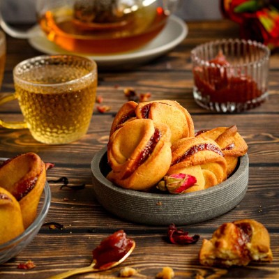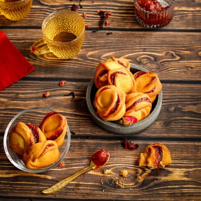 Kruche ciasteczka w kształcie różyczek z delikatnym nadzieniem to połączenie estetycznej formy i przyjemnego smaku. Każde ciastko jest ręcznie przygotowane, z wyraźnie wyczuwalną kruchością i lekką słodyczą wnętrza. Doskonałe jako kruche ciasteczka na prezent, do wspólnego podania lub jako element większego zestawu słodkości.