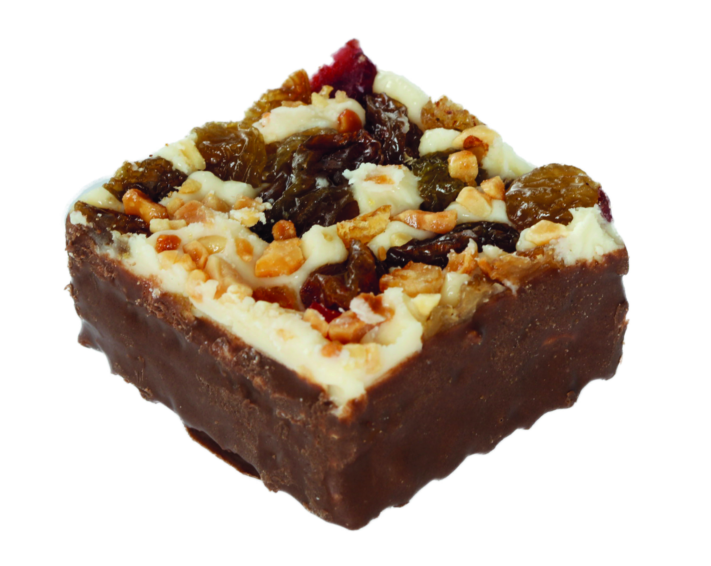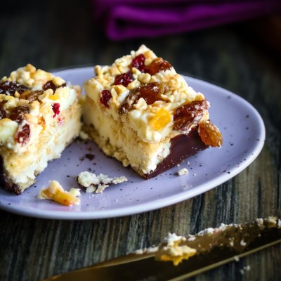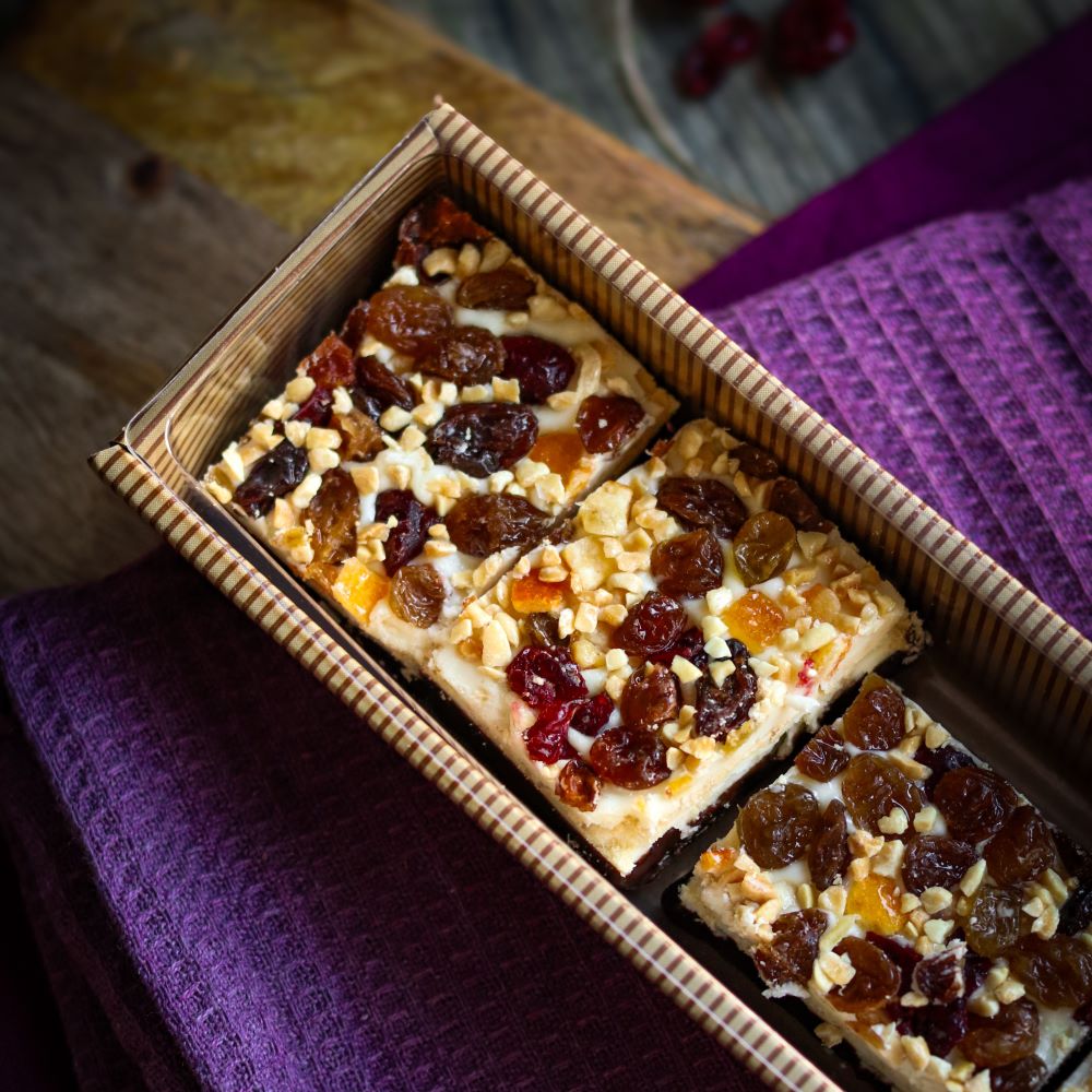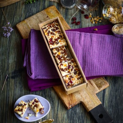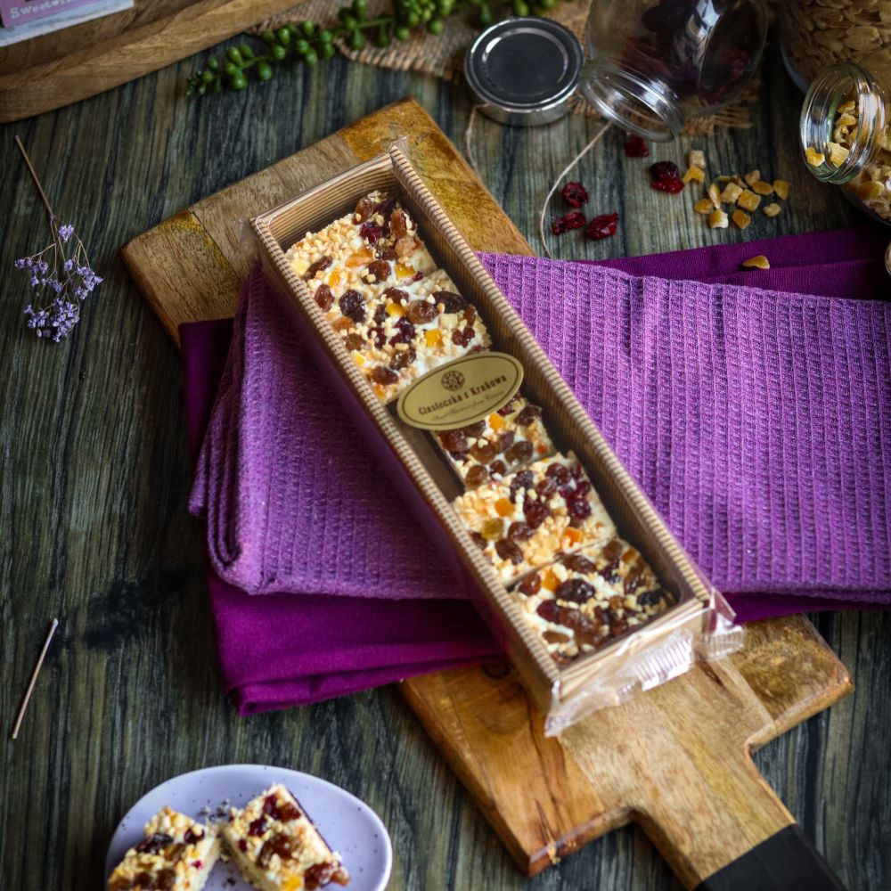 Kostka bakaliowa to wyjątkowy deser, który łączy w sobie chrupiące wafle i krem o delikatnym, śmietankowym smaku. Każda warstwa wafli przekładana jest aksamitnym kremem, a całość oblewana polewą o smaku czekoladowym, dodającą słodkiego wykończenia. Każde ciasteczko jest bogato udekorowane bakaliami: żurawiną, rodzynkami, skórką pomarańczową, płatkami kukurydzianymi i orzeszkami arachidowymi, które nadają mu wyjątkowej tekstury i bogatego smaku. To idealny wybór dla miłośników słodkości z dodatkiem owoców i orzechów, doskonały do kawy czy na specjalne okazje.