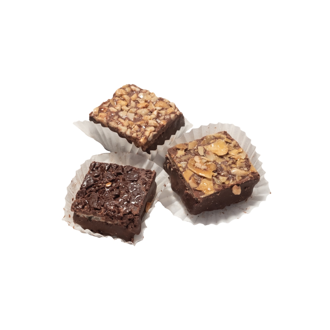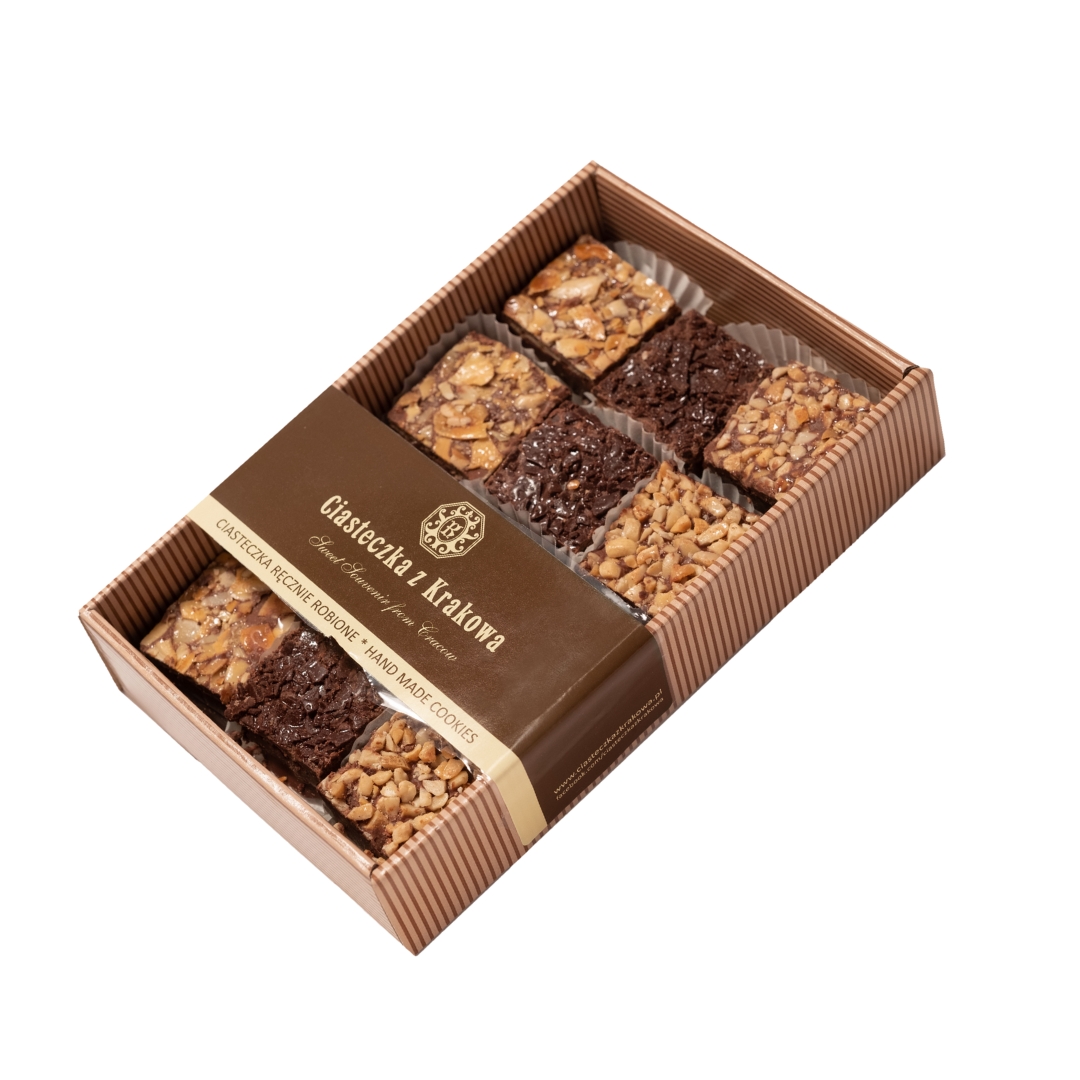 Kwadratowe wafelki przekładane kremem w trzech smakach: migdałowym, orzechowym i czekoladowym. Każdy kawałek ozdobiony jest pysznymi posypkami: orzeszkami arachidowymi, czekoladą i migdałami, a dodatkowo znajduje się w eleganckiej papilotce. Idealne na słodką przekąskę, do kawy lub jako słodki upominek. Rozkoszuj się różnorodnymi smakami i chrupkością!
