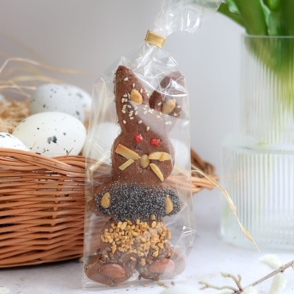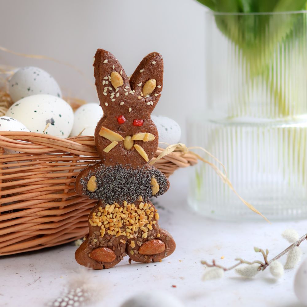 Aromatyczny zajączek wielkanocny z tradycyjnego ciasta piernikowego! Delikatnie korzenny, lekko chrupiący i udekorowany bakaliami. Doskonały jako świąteczny upominek, ozdoba wielkanocnego stołu lub słodka przekąska do kawy i herbaty.